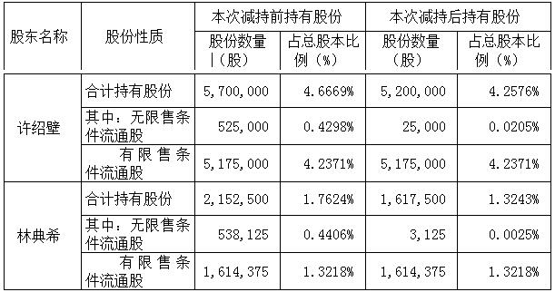 近日,公司收到股东许绍壁、林典希出具的《关于减持股份进展情况的告知函》,截至本公告披露日,股东许绍壁、林典希股份减持数量已过半。根据《深圳证券交易所中小板上市公司规范运作指引》、《上市公司股东、董监高减持股份的若干规定》、《深圳证券交易所上市公司股东及董事、监事、高级管理人员减持股份实施细则》等规定,现将有关情况公告如下: